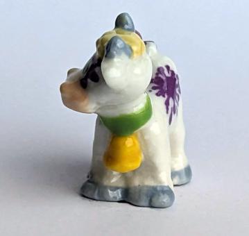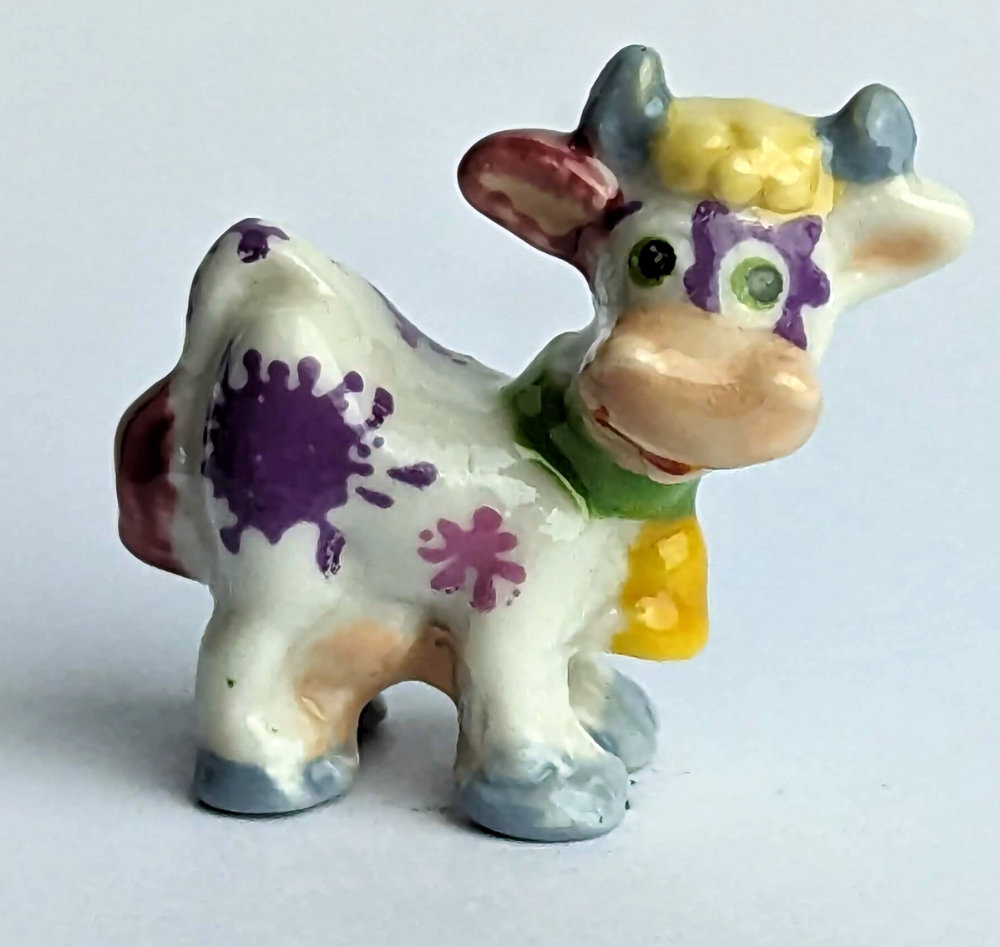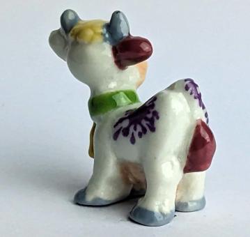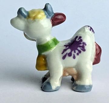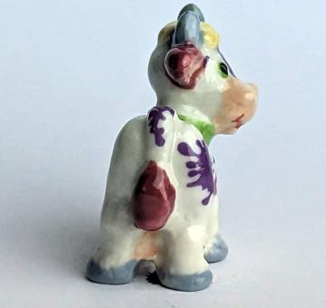 Die kleine, handbemalte Keramikfigur einer Kuh ist ein besonderes Kunstwerk, das sowohl durch seine künstlerische Liebe zum Detail als auch durch seine charmante Verwirrtheit besticht. Mit einer Größe von nur 2 cm ist sie das perfekte Accessoire für jeden Wohnraum oder Schreibtisch.